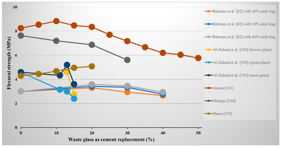 The influence of WG powder as cement replacement on the FS of composites has been displayed in Figure 15. It also shows an almost similar trend as CS and STS. For instance, the results of Rehman et al. [82] showed enhanced FS at 20% and 30% contents of WG powder while at 40% content of WG powder, the FS reduced compared to the reference sample. The highest value of FS was observed at 20% content of WG powder as cement replacement and 80% steel slag as fine aggregate replacement. Similar to the CS, the maximum FS was observed with neon glass at a 13% replacement ratio [100]. Also, the addition of WG with up to 20% content exhibited improvement in FS while a further increment in WG content reduced the FS than the reference sample [101]. Hama [103] also reported maximum FS at 20% replacement of cement by WG powder. However, several studies reported a reduction in FS with the utilization of WG powder as cement replacement [100,104], as shown in the figure. The reasons for the CS behavior of composites with WG addition also apply to the flexural behavior.