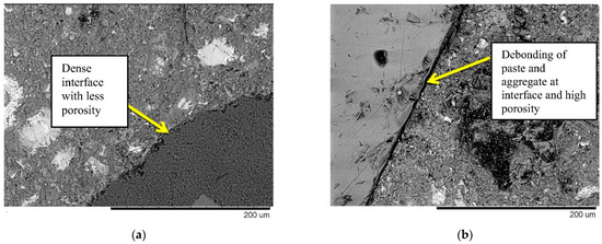 Microstructure of composites with: (a) natural aggregate; (b) waste glass aggregate (size: 4.75–9.5 mm) [105].