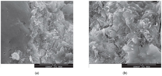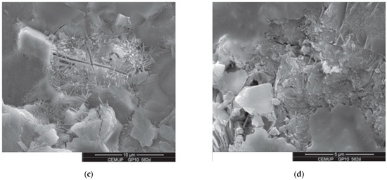 Microstructure of composites: (a) control mix, 10,000 times enlarged; (b) control mix, 20,000 times enlarged; (c) containing 10% waste glass powder, 10,000 times enlarged; (d) containing 10% waste glass powder, 20,000 times enlarged [108].