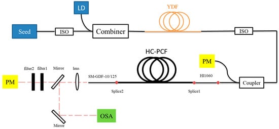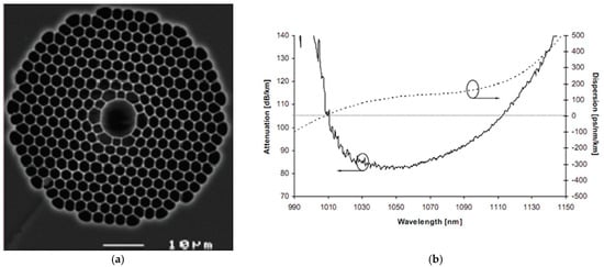 For the gas cavity, a 49 m long HC-PCF (NKT Photonics HC-1060-02, Rudersdal Municipality, Denmark) filled with 18 bar hydrogen is spliced to a solid-core fiber (Corning HI1060, Corning, NY, USA) as the pump injection end and the other end of the HC-PCF is spliced to another solid-core fiber (SM-GDF-10/125-15FA) as the output end. In our work, the end as the pump injection is spliced first and the other end of the HC-PCF is sealed into a specially designed gas chamber, which can keep the HC-PCF vacuumed and fill it with hydrogen. After standing for 10 h, the HC-PCF is taken out from the gas chamber and spliced with the solid-core fiber quickly. By calculating the amount of gas leakage in the fusion splicing process [], the gas pressure in the all-fiber gas cavity is estimated to be 18 bar. Besides, the fusion loss of mode field mismatch can be reduced by using these different solid-core fibers, and the fusion losses of splice1 and splice2 is 1.56 dB and 0.45 dB, respectively. Figure 3a presents the cross-section of the HC-PCF under the electron microscope (the core diameter is 10 μm), and Figure 3b presents the transmission loss and dispersion curves (from the product manual provided by NKT Photonics). It can be seen that the losses at 1064 nm and 1135 nm are ~0.083 dB/m and ~0.012 dB/m, respectively.