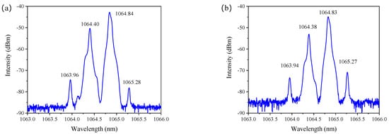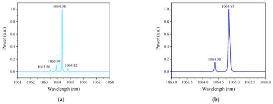 To display more clearly the power components of longitudinal modes, the spectral intensity in Figure 2b and Figure 5a is represented by a linear scale, as shown in Figure 6a,b. It can be seen that although the output spectrum contains many longitudinal modes when the pump pulse width is 2 ns, the power spectrum mainly contains four components with different wavelengths. The pump lines at 1064.38 nm and 1063.94 nm take up the dominant position with the ratio of 77.85% of the total output power. The power spectrum in Figure 6b indicates that when the pulse is 4 ns, the output power has only two main pump lines, and both can be converted into Stokes waves. By calculation, the lines at 1064.83 nm and 1064.38 nm account for 90.03% of the total output power, which is much higher than the case with the pulse width of 2 ns. Therefore, when the pump source is in the same output power and the pulse width is 4 ns, there are more pump lines with higher power participate in Raman conversion. This also explains why the second-order Stokes wave is not generated with the same pump power when the pump pulse is 2 ns.
