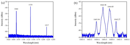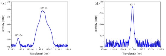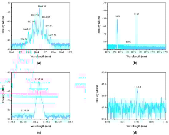 To explore the impact of the pulse width on the output characteristics of the all-fiber FGRL, we change the pump pulse width from 4 ns to 2 ns and keep the repetition frequency at 20 MHz. Figure 5a shows the output spectrum of the pump source with the maximum output power. It can be seen that there are many longitudinal modes. Figure 5b presents the output spectrum of the FGRL. There are mainly two lines in the output spectrum: a 1064 nm pump line and 1135 nm Raman line. Therefore, only the first-order Stokes wave is generated by the rotational SRS of hydrogen molecules, which is quite different from the case when the pump pulse width is 4 ns. There is a very weak line at 1106 nm that can only be detected by the highly sensitive OSA. It is also the first-order Stokes wave converted by the 1064 nm pump laser, and the corresponding Raman frequency shift is 354 cm−1. The corresponding Raman gain of 1106 nm is weaker than that in 1135 nm [], so the pump laser is converted into a 1135 nm Stokes wave first, and only a few pump lasers are converted into 1106 nm Stokes waves. Figure 5c,d shows the fine spectrum of the first-order Stokes waves at 1135 nm and 1106 nm, respectively, which indicates that only the pump lasers at 1064.38 nm and 1063.94 nm are converted into the first-order Stokes waves (the Stokes wave at 1106.1 nm is converted by the pump laser at 1064.38 nm). Due to the accuracy of spectrometer, the linewidth of these lasers cannot be measured accurately, and some Stokes waves are too weak to be measured. Compared with the pump source with the pulse width of 4 ns, there are more longitudinal modes in the pump source when the pulse width is 2 ns, which may lead to the dispersion of power and the Raman conversion is not as sufficient as the case with the pulse width of 4 ns when the pump power is the same. The absence of the second-order Stokes wave indicates that the first-order Stokes wave is not strong, which also means the conversion is not sufficient.