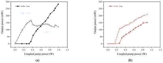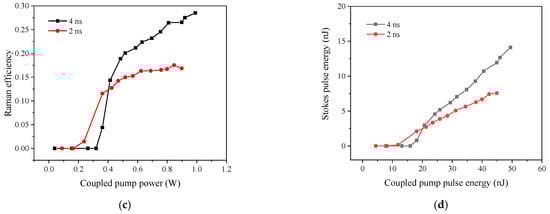 The output power characteristics of the FGRL with different pulse width of pump laser are measured, as shown in Figure 7a–c. The solid and hollow patterns in Figure 7a,b represent the Raman power and residual pump power, respectively. Moreover, the coupled pump power is the actual power that transmitted into the gas cavity after the Splice 1. It can be seen that with the increase in the coupled pump power, the Raman power with the pulse width of 2 ns is detected first. This is because the pump pulse with width 2 ns is narrower, which means the corresponding peak power is higher than the pulse with the width of 4 ns when the pump power is the same and exceed the Raman threshold earlier. Both the Raman powers with different pulse widths increase linearly. The residual pump power with the pulse width of 4 ns drops when the coupled pump power exceeds the Raman threshold, while it keeps increasing when the pulse is 2 ns. It indicates the Raman conversion is not sufficient when the pulse width is 2 ns in the case. The corresponding Raman efficiency (the ratio of coupled pump power to Raman power in the gas cavity) is calculated, as shown in Figure 7c. The maximum Raman efficiency 28.5% is obtained with the maximum coupled pump power and the pulse width is 4 ns. Besides, the Stokes pulse energy and the coupled pulse energy are explored in the Figure 7d. It can be seen that the Stokes energy with the pulse width of 4 ns is higher in general.