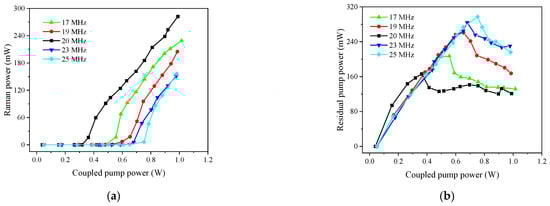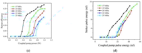 Furthermore, we measured the output power characteristics of the FGRL with different repetition frequencies and the same pulse width of 4 ns. Except for the repetition frequencies, the characteristics of the pump pulse like duration and spectral content are the same. Figure 8a,b presents the evolution of Raman power, residual pump power, and Raman efficiency with the increase of coupled pump power, respectively. It can be seen from Figure 8a,b that the curves with different repetition frequencies show similar trends. All the Raman powers increase linearly, while all the residual powers increase at first and then drop when the coupled pump power exceed the Raman threshold. Obviously, the optimal repetition frequency is 20 MHz with the lowest Raman threshold and the highest Raman power among the five repetition frequencies. When the repetition frequency is less than 20 MHz, the peak powers of the pump pulse and Raman pulse will become higher, which is conducive to the conversion of the second-order Raman laser. When it is higher than 20 MHz, less energy of pump pulses that exceed the first-order Raman threshold are converted into Raman pulses. Both situations will reduce the first-order Raman conversion efficiency. Figure 8c depicts the Raman efficiencies with different repetition frequencies. The maximum Raman efficiency is 28.5% in 20 MHz as mentioned earlier, which is more efficient than the previous work []. The corresponding Raman power is 289 mW, which is the maximum output Raman power. Compared with the previous work [], the output power is increased by an order of magnitude. The pulse energy of Stokes pulse and coupled pump pulse is explored as shown in Figure 8d. It can be seen when the repetition frequency is 20 MHz, the Stokes pulse has the highest energy.