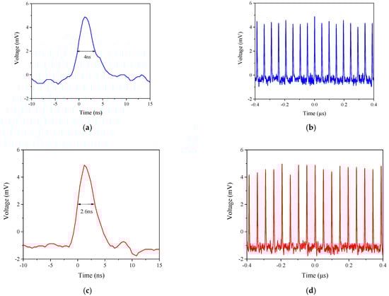 Figure 9a–d presents the shapes and the series of the pump pulses and the Stokes pulses when the pump power is maximum and the repetition is 20 MHz. It can be seen that the frequency of the Stokes pulses is 20 MHz, which is the same as the pump pulses. The pulse widths are measured, as shown in Figure 9a,c. It can be seen that the width of the Stokes pulse is narrower than that of pump pulse. This is not unexpected, because only the center part of the pump pulse that is higher than Raman threshold can be converted into the Stokes pulses.