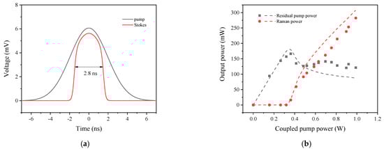 In our work, Figure 10a presents the simulation result of the pump pulse shape and the first-order Stokes pulse shape based on the theoretical model. Here is 3.1 GHz []. And is 0.35 cm/GW and is 0.18 cm/GW, which is estimated and adjusted slightly from in [,,]. The mode field diameter of the HC-PCF is 7.5 μm and is 14.06π μm2. The pump pulse width is 4 ns and the repetition frequency is 20 MHz. It can be seen the Stokes pulse width is ~2.8 ns, which is in good agreement with the experimental results. Figure 10b shows the simulation results of the output power characteristics in the same case. For better comparison, the experimental results are plotted with solid patterns, while the simulation results are plotted with dotted lines. We can find that both the results show the similar trend and with the increase of the coupled pump power, the experimental results are in good agreement with the simulation results at first, then there is a deviation between them. We speculated that the homemade pulsed YDFA may has some continuous wave components which are useless in the Raman conversion and its power increases with the increase of coupled pump power. We hypothesize that by optimizing the performance of the amplifier, we can achieve better agreement between the experimental results and the simulation results.