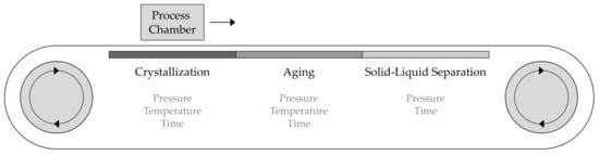 Conventional production techniques are characterized by the fact that almost every step is carried out on a different plant. On the one hand, this demands transport equipment such as pumps or pipelines, and on the other hand, increases the space requirement and the risk of undesirable product contamination during transfer between the individual units []. As a result, integrated plants become more and more important. Already established examples from the field of process engineering are the Titus-Nutschen Dryer [], the Konfiltro [] and the Belt Crystallizer developed by Dobler et al. []. The latter combines cooling crystallization, solid–liquid separation and contact drying on a belt filter and is used for quasi-continuous manufacturing of crystalline particles.