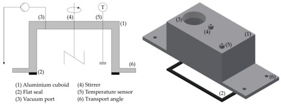 Schematic (left) and CAD drawing (right) of the process chamber. The component consists of a rectangular aluminum cuboid (1), a flat seal (2) and connections for vacuum (3), stirring tool (4) and temperature sensor (5). The front sides are provided with angles to ensure exact positioning and transport (6).