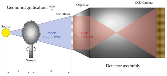 Micro Computer-Tomography (µCT) is a technique which allows the destruction free analysis of a sample’s three-dimensional structure. The working principle of the µCT (XRadia 520 Versa, Carl Zeiss Microscopy GmbH, Oberkochen, Germany) is depicted in Figure 3.