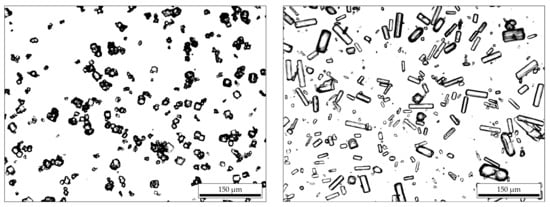 Figure 5 shows microscopy images of the crystals obtained. The picture proves that both isometric (left) and rod-shaped particles (right) can be formed in the process chamber. In addition to the successful demonstration of the device’s functionality, it is also noticeable that the isometric crystals tend to agglomerate and form cluster-like structures. This agglomeration leads to undefined particle properties and complicates the optical evaluation of the microscopy data. In the case of the rods, such behavior is not detectable.