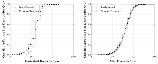 In summary, Figure 6 verifies that particles with almost identical size properties as in conventional production may be manufactured using the process chamber. However, the plots also reveal that reproducibility with isometric particles is low, which can be seen by the large variations in the particle size distribution. These deviations are due to agglomeration and the absence of seed crystals [] and prevent consistent product quality. Thus, only rod-like particles are used in the further studies.