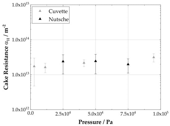 As can be seen in Figure 7, the height specific cake resistance from the filtration cuvette and pressure nutsche are in good agreement. All data shown result from permeation experiments using the same membrane (Ultipor® , Pall GmbH, Dreieich, Germany) as filter medium. For the cuvette the height specific cake resistance lies between – in a pressure range of – . In the case of the nutsche filter the cake resistances are similar, ranging between – for permeation pressures of , and . Hence, the transformation from the batch vessel into the process chamber on a quasi-continuous apparatus did not affect the overall cake resistance. Additionally, the small scale filter setup is suitable to correctly characterize filtration resistances with low sample volumes.