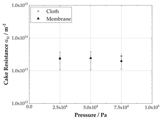 The resistance of the two filter media against permeation with supernatant is for the membrane and for the filter cloth. This indicates a much lower filter medium resistance for the cloth than for the membrane. It should be noted that determining medium resistance with particle free supernantant leads to underestimation of the actual medium resistance when using a suspension. However, the resistance of the cloth with particle free supernatant is three magnitudes smaller than the total resistance of the filter cake and is negligible, even with particles present. Comparing the cake heights between the two filter media leads to for the filtration setup with a membrane and to for the filter cloth. Thus, neither the cake height nor the resistance show a significant change when using a filter cloth instead of a membrane.