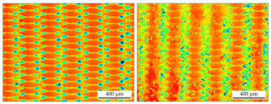 In addition to the permeation time, we also observe the influence of the crystallization and aging step on the filter cloth. For this purpose, a laser scanning microscope is applied to create a height profile of the filter medium. The color scale ranges from blue to red. Red represents elevations, such as warp and weft threads, and blue dents, like pores. The left side of Figure 9 shows an unused filter cloth, revealing the pores and surface structure. The right side of Figure 9 displays a filter media after the crystallization and aging procedure. In contrast to the unused one, it exhibits local contamination. However, the original surface including the pore structure is still visible, so the influence on the overall process is negligible.