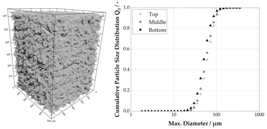 To exclude the possibility of segregation effects, the filter cake is finally analyzed with µCT. Therefore, we determine the particle size distributions in a top, middle and bottom scan of the cake. Figure 10left, shows as an example the bottom scan of the filter cake. The 3D rendering already indicates homogeneity over the cake height. To further quantify this impression the distributions obtained from the µCT scan are shown on the right-hand side of Figure 10. It is noticeable that the particle properties in the individual layers are almost identical, which in turn suggests the formation of a homogeneous cake. The same observations can be made when analyzing the particle size distribution of a filter cake from the pressure nutsche with the µCT (data not shown). Those distributions are nearly identical to the ones from the enhanced belt crystallizer.