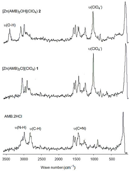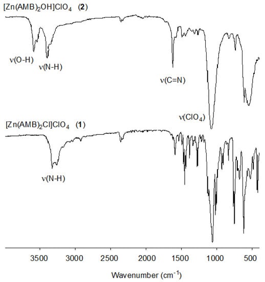 FTIR spectra of zinc(II) model complexes [Zn(AMB)2Cl](ClO4) 1 and [Zn(AMB)2(OH)](ClO4) 2.