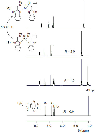 The stoichiometry of zinc(II) complex 1 was determined by recording the chemical shifts of the pyridine and methylene protons of the produced zinc(II) complex 1 at different ratios of solutions of the zinc salt and the ligand AMB: R([Zn2+]0/[AMB]0) = 0, 1.0, and 2.0 in CD3OD:D2O (3:1). In 1H NMR spectra (Figure 4), the methylene resonances are displaced toward lower frequencies (△ = 0.42) with respect to the AMB∙2HCl, which demonstrates that H2N→Zn coordination is present in solution. Figure 4 also showed that with increasing the concentration of zinc(II) ions, there are broadening and downfield shifts of the pyridine and methylene protons of the produced zinc(II) complex species between 0 < R < 2. This finding can be attributed to the exchange interaction between the complex at the molar ratio 2:1 and the free ligand. Further increments of zinc(II) ions do not change the chemical shift, that is why the formation of zinc complexes with 2:1 stoichiometry is thought and the composition is [Zn(AMB)2Cl]+ 1, mononuclear model complex. The 1H NMR spectrum of the hydroxo complex [Zn(AMB)2(OH)]+ 2 showed that the methylene and pyridine nitrogen of the benzimidazole ring were upfield shifted in comparison to the chemical shift of zinc(II) complex in [Zn(AMB)2Cl]+ 1 (Figure 4) [21,22,23,24]. The 0.4–0.6 ppm downfield shift for zinc-bound OH compared with the chemical shift of free water resulted from the decrease in electron density due to the coordination to zinc(II) ion. This is mainly attributed to the effect of the Lewis acidity of zinc.
