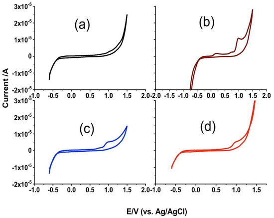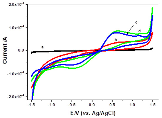 Cyclic voltammetric response for: (a) bare carbon paste electrode, (b) carbon paste electrode modified with AMB ligand, (c) carbon paste electrode modified with complex 1 and (d) carbon paste electrode modified with complex 2. These used 5.0 mM K3[Fe(CN)6]/K4[Fe(CN)6], a potential scan rate of 50 mV s−1 and a potential range from +1.5 to −1.5 V (vs. Ag/AgCl).