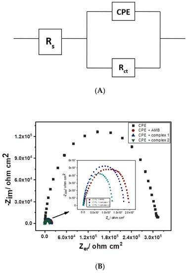 To obtain detailed information about the electrode/solution interface, the electrical equivalent circuit from the CPE modified by zinc(II) complex 1 and 2 in the absence and presence of [Fe(CN)6]3−/4− as an electrochemical redox system compatible is shown in Figure 6a. This system comprises a solution/electrolyte resistance (Rs), a constant phase element (Q), corresponding to the double layer capacitance, and a charge transfer resistance (Rct) associated with the oxidation of low valence mediator species. Figure 6b represents the Nyquist diagrams of the bare CPE and the CPE modified with the AMB ligand and Zn(II) complex 1 and 2 in a solution containing 5.0 mM of [Fe(CN)6]3−/4− and 1.0 M of KCl. The Nyquist plot is a semicircle domain with Rct of ~312.735, 19.725, 14.65 and 12.540 KΩ cm2 for the bare CPE, CPE modified with ligand AMB, zinc(II) complex 1 and complex 2, respectively. This result showed that, upon addition of the ligand AMB, zinc(II) complex 1 and 2 to CPE, the shape of Nyquist plot is decreased in comparison to bare CPE. The polarization resistance for the three electrodes was increased in the sequence of bare CPE > CPE modified by the ligand AMB > CPE modified by the zinc(II) complex 1 > complex 2. The lower value of Rct at the surface of CPE modified by Zn(II) complex 2 indicates that Zn(II) complex 2 can promote the electron transfer and accordingly accelerates the diffusion of ferricyanide towards the electrode surface, which improves the conductivity. In addition, complex 2 showed a lower Rct value than 1, which indicates that the former is more active. So, the conductivity was improved by the modification of CPE by Zn (II) complex 2.