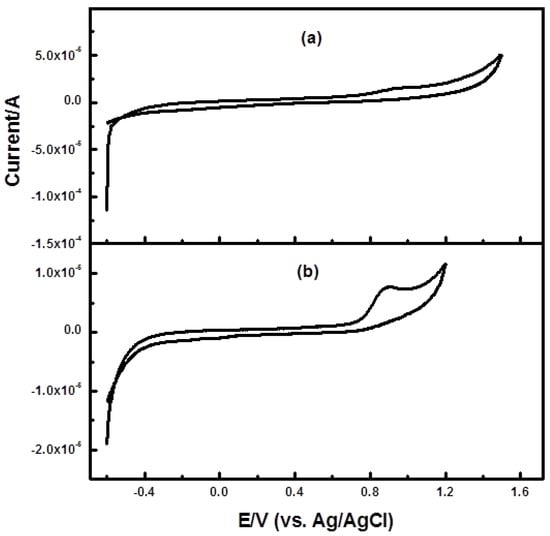 Electrochemical behavior of 1 × 10−3 M (a) parathion and (b) fenitrothion in a phosphate buffer (pH = 8.0) using cyclic voltammetry.