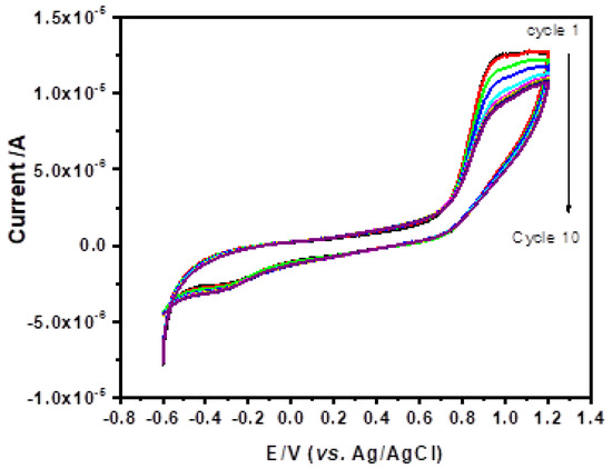 To examine the stability of the prepared biomimetic sensor, ten repetitive cyclic voltammograms of both parathion and fenitrothion (1 × 10−3 M) in phosphate buffer (pH 8) in presence of CTAB (1 × 10−3 M) were recorded. The peak current of fenitrothion decreased by repeating the cyclic voltammograms from cycle 1 to 10 (Figure 9).