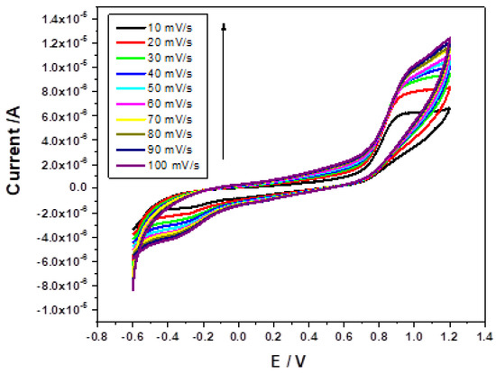 Effect of scan rate (from 10 to 100 mV/s) on the cyclic voltammograms for 1 × 10−3 M fenitrothion in phosphate borate buffer pH 8 in presence of CTAB with 50 mV/s scan rate.