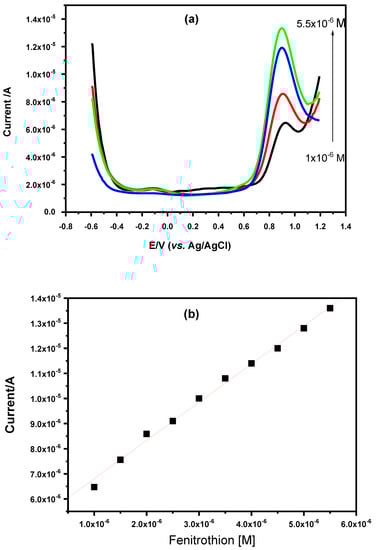 3.7. Square Wave Voltammetric Determination of Fenitrothion and Parathion