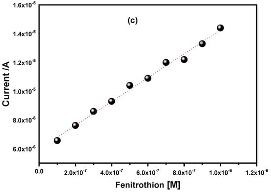Effect of different concentration in the square wave voltammetric voltammograms on the peak current signal for fenitrothion (a), calibration plot for fenitrothion (b) and calibration plot for parathion (c) in a phosphate buffer (pH = 8.0) using cyclic voltammetry.