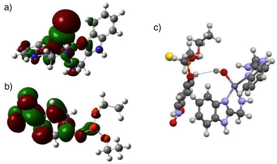 (a) Calculated (DFT) HOMO orbital of the complex 2, (b) calculated (DFT) LUMO orbital of the substrate (Parathion) and (c) the calculated (DFT) 2. OPs complex stabilized by hydrogen bond.