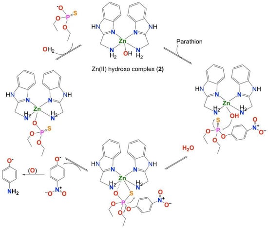 Simultaneously, the zinc ion withdraws electron density away from the phosphorus atom, forming a penta-coordinated intermediate (Scheme 2). Finally, the p-nitrophenolate is released and the zinc(II)-bound diethyl thiophosphate, which could be isolated from the solvent and replaced by water to form again the starting catalyst aqua zinc(II) complex, which is ready to start another catalytic cycle.