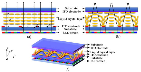 Figure 1 depicts the side view of the proposed multi-view 2D/3D switchable display with cylindrical LC lens array in the voltage-off and voltage-on states. In order to fabricate the cylindrical LC lens array, a planar ITO electrode is deposited on the inner surface of the top glass, and the planar ITO works as a grounding electrode. On the other hand, the planar ITO electrode of the bottom substrate is etched into the periodic strip electrodes, and the operating voltage is applied to the bottom periodic strip electrodes. A polyimide (PI) layer is coated on the inner surface of the top and bottom glass substrates, and then the LC director distribution is homogeneously aligned perpendicular to the periodic strip electrodes’ direction. The liquid crystal display (LCD) screen is used to provide the display image. In Figure 1a, the LC director distribution aligns homogeneously in the cell in the voltage-off state. This means that the refractive index of the LC layer is uniformly distributed. At this time, the rays emitted by the LCD screen will not be deflected after passing through the LC layer. In order to realize 3D display, each cylindrical LC lens should cover at least two subpixels; in addition, short focal length is beneficial to achieve a larger 3D viewing angle. As shown in Figure 1b,c, in the voltage-on state, the strong spatial inhomogeneous electric field distribution between the top and bottom electrodes is generated. Thus, the LC molecules tend to align in parallel with the spatial inhomogeneous electric field direction. At this time, the incident rays are periodically deflected and focused on the ideal focal plane for the 3D image mode.