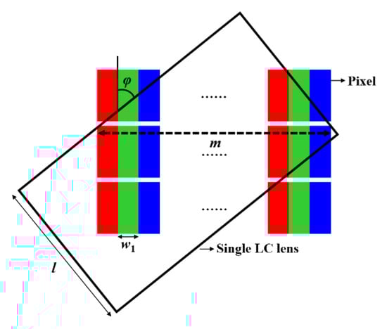 LCD usually has a large periodicity of pixels composed of red (R), green (G), and blue (B) sub-pixels, which is the main reason for the visible color moiré pattern that always appears in 3D displays []. The color moiré pattern impacts the quality of 3D images seriously, and many technologies have been proposed to reduce the moiré patterns of 3D displays [,,,]. To reduce the color moiré pattern, we introduce the tilted elemental image arrays []. The cylindrical LC lens array should match the tilted elemental image arrays. In other words, the slope k of the cylindrical LC lens array needs to be calculated. As shown in Figure 2, the angle between each cylindrical LC lens and pixel is φ, in one direction, and the maximum number of sub-pixels covered by each cylindrical LC lens is m. At the same time, the number of viewing points is also m, the width of each sub-pixel is w1, the pitch of the cylindrical LC lens array is l1, and the slope k can be derived from the following formula: