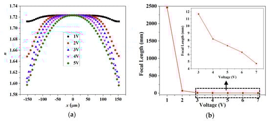 Simulated (a) refractive index distribution of the cylindrical LC lens array with different operating voltages and (b) voltage-dependent focal length of the cylindrical LC lens array.