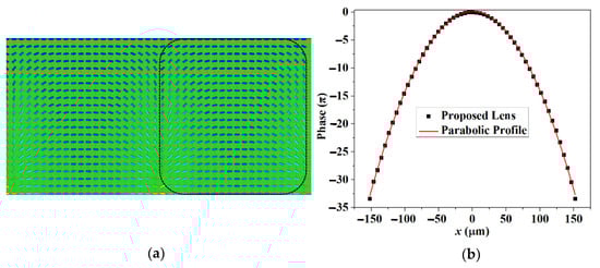Simulated (a) LC director distribution and (b) relative phase profiles for the extraordinary ray of the proposed cylindrical LC lens array.