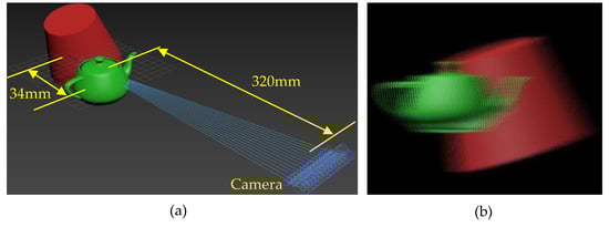 To verify the feasibility of the proposed scheme, the virtual 3D scenes were built in 3 ds Max. A 1 × 14 camera array was built to obtain the 3D image source of the 3D scenes, as depicted in Figure 5a. In the 3D scene, the “teapot” is located in front of the “circular truncated cone”, and the distance between the “teapot” and “circular truncated cone” is 34 mm, the distance between the camera and the center depth plane is 320 mm, and the gap between each camera is 5 mm. Figure 5b shows the final composite image, and the slope of the EIA is 0.1109.