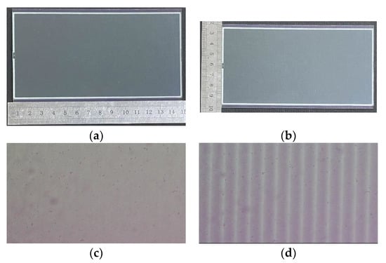 Fabricated cylindrical LC lens array with size of (a) length 140 mm, (b) width 70 mm, and the focusing effect of the cylindrical LC lens array with (c) 0 V and (d) 5.4 V operating voltages.