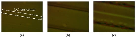 Interference fringes of the cylindrical LC lens array with (a) 0 V, (b) 5.4 V, and (c) 8 V operating voltages.