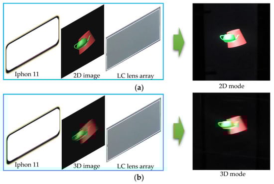 In order to solve these problems, an LC lens array has been proposed. The basic operation mechanism of the LC lens array is to generate the electric-field-induced gradient refractive index profile across the LC layer [,,,,,]. Various 2D/3D switchable displays based on an LC lens array have been investigated in recent years []; for example, there is the dynamic integral imaging (InIm) display using the electrically movable LC lens array [], the 2D/3D switchable mobile display using the liquid crystal polymeric (LCP) lens array film [], and the dual-direction overdriving method for accelerating the 2D/3D switching time of the LC lens array on auto-stereoscopic display []. The dynamic InIm display using the electrically movable LC lens array can eliminate the multifacet phenomenon in the 3D images. However, for the integrated imaging 3D display, low resolution is an inherent problem. The 2D/3D switchable mobile display using a polarization-dependent switching LCP lens array film can realize the high-resolution 3D display, but the device needs an additional twisted nematic LC cell to control the polarization direction of light. The dual-direction overdriving method can achieve fast switching between 2D and 3D modes. However, the operating mode of the LC lens array is relatively complex.