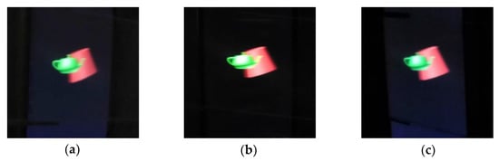 Figure 8a,b shows the 2D/3D switchable display with the voltage-off and voltage-on (5.4 V) state of the cylindrical LC lens array. The LCD panel is the iPhone11. The sub-pixel size of the LCD is about 26 μm, so the number of viewpoints is set to 14. Figure 8a shows the 2D image with the cylindrical LC lens array at the voltage-off state. From Figure 8a, we can find that in the voltage-off state, the cylindrical LC lens array does not affect the quality and brightness of 2D images. Figure 8b shows the 3D display with the cylindrical LC lens array at the voltage-on state, and, compared with Figure 5b, a clear 3D image effect is displayed. To further verify the 3D display effect, the display effect under different views is given. Figure 9a–c shows the 3D images captured at different oblique viewing angles when the 3D model is displayed on the LCD panel under the voltage-on state of the cylindrical LC lens array. The viewing angle of the center view is 0°, where the different perspectives of the “teapot” and the “circular truncated cone” can be observed, and a wide viewing angle is achieved. For more detail, please see Video S1 in Supplementary Material. In Video S1, the different perspectives of the “teapot” and the “circular truncated cone” images can be observed, and the sense of stereo dimension is strong. Besides, a relatively wide viewing angle and high resolution are achieved.