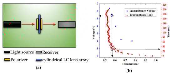 (a) Response time measurement platform and (b) response time of the cylindrical LC lens array.