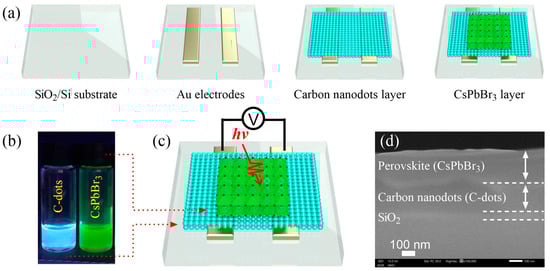 - Algadi, H.; Mahata, C.; Woo, J.; Lee, M.; Kim, M.; Lee, T. Enhanced Photoresponsivity of All-Inorganic (CsPbBr3) Perovskite Nanosheets Photodetector with Carbon Nanodots (CDs). Electronics 2019, 8, 678. [Google Scholar] [CrossRef]