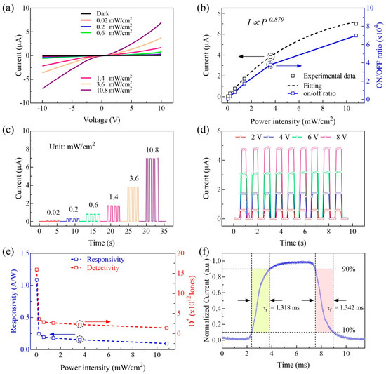 - Song, X.; Liu, X.; Yu, D.; Huo, C.; Ji, J.; Li, X.; Zhang, S.; Zou, Y.; Zhu, G.; Wang, Y.; et al. Boosting Two-Dimensional MoS2/CsPbBr3 Photodetectors via Enhanced Light Absorbance and Interfacial Carrier Separation. ACS Appl. Mater. Interfaces 2018, 10, 2801–2809. [Google Scholar] [CrossRef]
