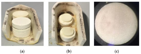 Pellets of Ga40-LLZO before (a) and after (b) the final sintering step at 1230 °C, the top and bottom pellets are buffer pellets of the same composition. (c) A pellet of Ga40-LLZO under a stereo-loupe; note, the diameter of the pellet is 8 mm.