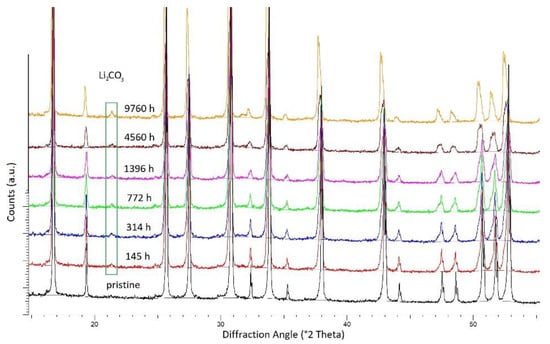 During aging in air, lattice parameters generally expand, which is indicative of Li+-H+ exchange reaction as proposed in the literature [14,17,20,24,25,30]. In detail, individual peaks in the PXRD pattern of Al10-LLZO shift to lower Bragg angles (indicative of an increase in lattice parameters) with increased exposure to dry air. Some shoulders appear at the low angle sides of the peaks and small amounts of Li2CO3 appear, probably as a product of CO2 in the air reacting with LiOH, which forms on the surface. This is shown for some selected aging times in Figure 2.