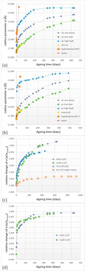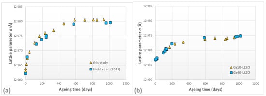 The lattice parameters increase, especially within the first 100 days. However, the Li+-H+ exchange is distinctly slower than that in the powder material (cf. Figure 3c and Figure 4a). The lattice parameter stabilizes to a value of ~12.9805 (2) Å after long exposure times. Data from Hiebl et al. [25] are included in Figure 4a and there is a good agreement between both data sets, with distinctly higher data density in the results of this study, so calculated trends will be more reliable. Generally, even short exposure to air induces some modification, which can be followed in a variation of the structural parameters.