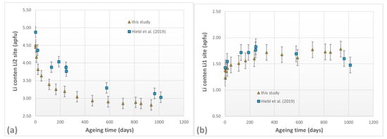 Both Li-sites are only partly filled. This is discernible in the first refinement cycle. Here the electron density at both sites is modeled using the assumption that only Li occupies these sites. In this model, the Li1 site in the pristine sample is 67% full, and the Li2 site only 38% full. Interestingly, the electron density increases at the Li1 site with prolonged storage but decreases at the Li2 site. As vacancies exist, Li+ and Al3+ are assumed to occupy the regular tetrahedral sites, but it is impossible to independently determine the Al3+ content. A value of 0.1 apfu is used based on previous studies that used EDX analysis on analogous material [5,9], which was prepared under identical synthesis conditions: i.e., identical amounts of the same starting materials, same experimental setup, and procedure, etc. With all the Al3+ assigned to the Li1 site and its value fixed, the Li+ content on both Li1 and Li2 sites can now be easily refined.