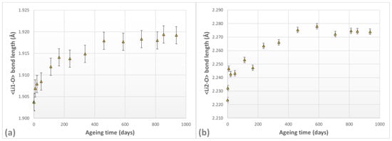 Figure 9a shows the changes in unit cell dimension for the shorter La–O bonds: while the phase change causes a distinct splitting of these bond lengths, they are stretched to a small extent towards the larger unit cell parameters during prolonged aging. The Zr–O bonds are more affected (Figure 9b). The bonds in tend to decrease, but there is a district distortion of the octahedron during the phase change due to both a displacement of the oxygen atoms and a shift of the Zr4+ atom to the 16c position. Zr–O bond lengths start to change by ~0.04 Å on approaching the phase change and continue to change during further aging. The splitting of the tetrahedrally coordinated 24d position into two sites is also reflected in the bond lengths: the distance between Li1 (12a) -O1 sites increases while the bond with the Li2 site (12b) shrinks upon symmetry change. Highly charged doping cations seem to prefer the larger tetrahedral Li1 polyhedron. Within the phase, Li1–O1 and Li2–O2 bond lengths increase by 0.037 and 0.032 Å, respectively. Even if significantly greater estimated standard deviations than those applied to are applied, the smooth and steady increase in values indicates that the changes are real. The average of four Li3–O distances of the interstitial Li atom (96h, 48e) also increases, whereby for individual bonds, the smaller distance between Li3 and the O1 oxygen atoms decreases from 1.916 (14) to 1.894 (14) Å. It is also observed that the Li1–Li3 interatomic distance increases whereas that between Li2 and Li3 decreases, i.e., the Li3 site moves closer to the Li2 site during aging. This is interpreted to be due to increasing repulsion due to the incorporation and bonding of H+ to the O1 oxygen, and Li is shifted toward the non—hydrated O2 oxygen atoms of the Li2–O2 tetrahedron.