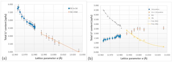The lattice parameters of the aged samples correlate well with the refined total Li+ content (Figure 8). Some slight non-linear behavior within the phase is observed that may be due to the cation migration from the 96h to 24d positions. The phase transition to occurs when Li+ contents are between 4.2 and 4.5 apfu, corresponding to estimated H+ contents of between 1.2 and 1.5 apfu. An increase in occupation of the tetrahedral 24d position was observed in the phase during aging and increase of the lattice parameter. This trend is prolonged within the phase (sum of the occupation of 12a and 12b sites) but tends to stabilize at an occupation value of ~2.5 apfu. Thereby, 12a and 12b sites behave differently: while occupation at the 12a site steadily increases from 0.86 (2) apfu to 1.43 (2) apfu, thus obtaining almost full occupancy, that at the 12b site fluctuates around 1.00 apfu. Li+ occupation of the interstitial 96h () and 48e () positions is distinctly reduced. Consequently, it becomes very evident that replacement of Li+ by H+ takes place at the general interstitial sites, whereas the Li+ in the regular tetrahedral sites of the garnet structure seems to be more rigidly bonded and does not take part in the exchange reaction unless there is some Li+ at the general 48e sites.