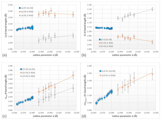 During the phase change of the phase, bond lengths change, and lattice parameters increase with increasing Li+ replacement. There are two independent La–O bond lengths in the phase (see Table 3); these split into four in the structure.