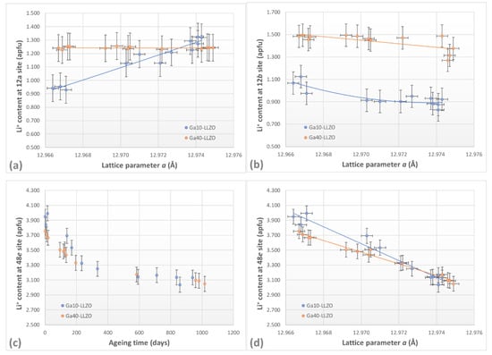 In data evaluation, the refinement strategy is the same as that outlined in detail in [7]. Li+ is distributed over three sites; Li1 and Li2 are on the two regular tetrahedral sites (12a and 12b, respectively), and Li3 is on the general position 48e. As for Al-LLZO, the electron densities at the Li sites in Ga40-LLZO were first modeled with Li-scattering factors only, and a distinct (Li1) and a very small (Li2) over-occupation is observed. Therefore, the stronger scattering ion, Ga3+, should also be included in the modeling. Hence, in the second step of refinement, the Li1 and Li2 sites are assumed to be fully occupied with Li and Ga. The results show that Ga3+ has a strong preference for the Li1 site with 0.26 apfu Ga3+ at Li1 and ~0.01 apfu Ga3+ at the 12b site; this is in agreement with the findings of Wagner et al. [8]. The Li3 site is filled to ~61%. The situation is somewhat different for low nominal Ga3+ contents, i.e., for Ga10-LLZO. Here there is no overpopulation of the 12b site evident when Li+ only is used to model the electron density at this site, but some vacancies are present. This is presented as strong evidence that no Ga3+ enters the 12b site. Also, the refined Ga3+ content at the 12a site increases over storage time, when the full occupation of this site is assumed and the scatter is modeled using Li + Ga = 1. An increasing Ga3+ content during storage time in a wet environment, however, is rather unrealistic. The Ga3+ content stabilizes at high storage time to values of ~0.12 apfu, which is used here for all measurements. Thus, the total cation occupation at Li1 was lowered accordingly so that the Ga—content approaches this value, i.e., different amounts of vacancies are considered. The main results of these refinements are compiled in Figure 10.